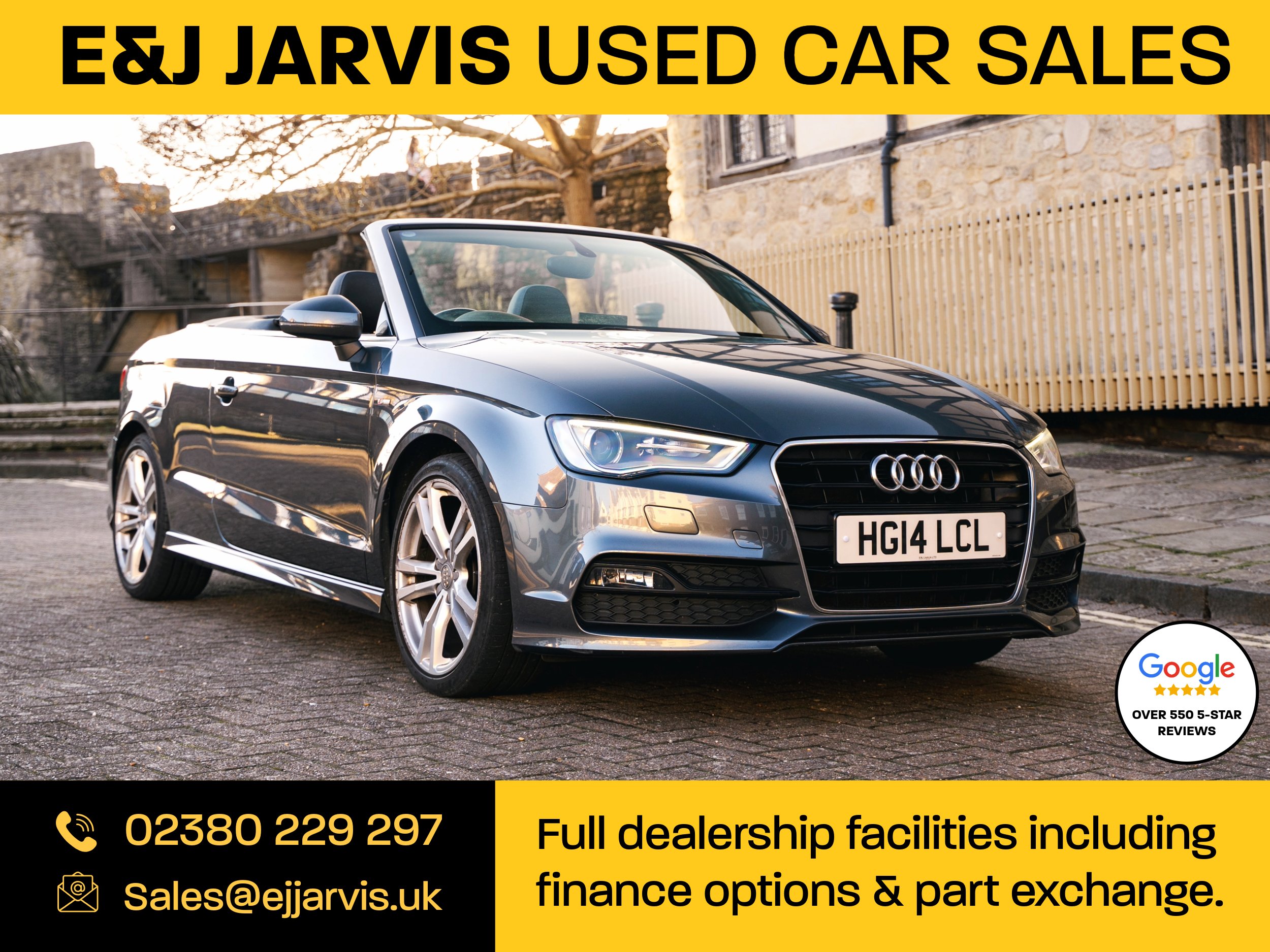 This 2014 Audi A3 1.4 TFSI S-Line Convertible has covered 73,000 miles from new and is presented in fantastic condition ready for the summer ahead. The current owner has had the car since 2019 and looked after it well in this time period with a service every year, cam belt and water-pump change and a full service at the end of 2025. Features include a fully-functional electric folding roof, dual zone climate control, DAB digital radio, automatic head lights and selectable drive modes. Being an S-Line example the car also benefits from S-Line external body styling, recently refurbished 18 inch alloy wheels and S-Line interior styling including half leather sports seats and a flat bottom steering wheel. Powered by a 1.4 litre TFSI turbocharged engine twinned with a 6 speed manual transmission this is a great choice for someone wanting a sports-car experience while keeping the MPGs reasonable (a claimed 55+ MPG in this instance!). E&J Jarvis have been selling and servicing cars in Southampton since 1947 and offer full dealership facilities including finance and part exchange options. See our 600+ 5 star Google reviews. Car being sold on behalf of our customer. Plate with vehicle is HG14 LCL. -